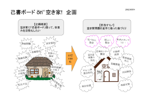 己書ボード企画スタート ニュースリリースhamamura2025年3月5日0 越ケ浜地区に限定した空き家対策「己書ボード」をスタートさせます。 沢山の空き家を散策して楽しく元気になる!? 興味あるる方は、浜村まで連絡ください。 第一号旧大津屋