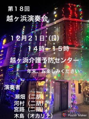 - 第18回越ケ浜演奏会日時:12月21日(日) 14時から15時 場所:越ケ浜介護予防センター